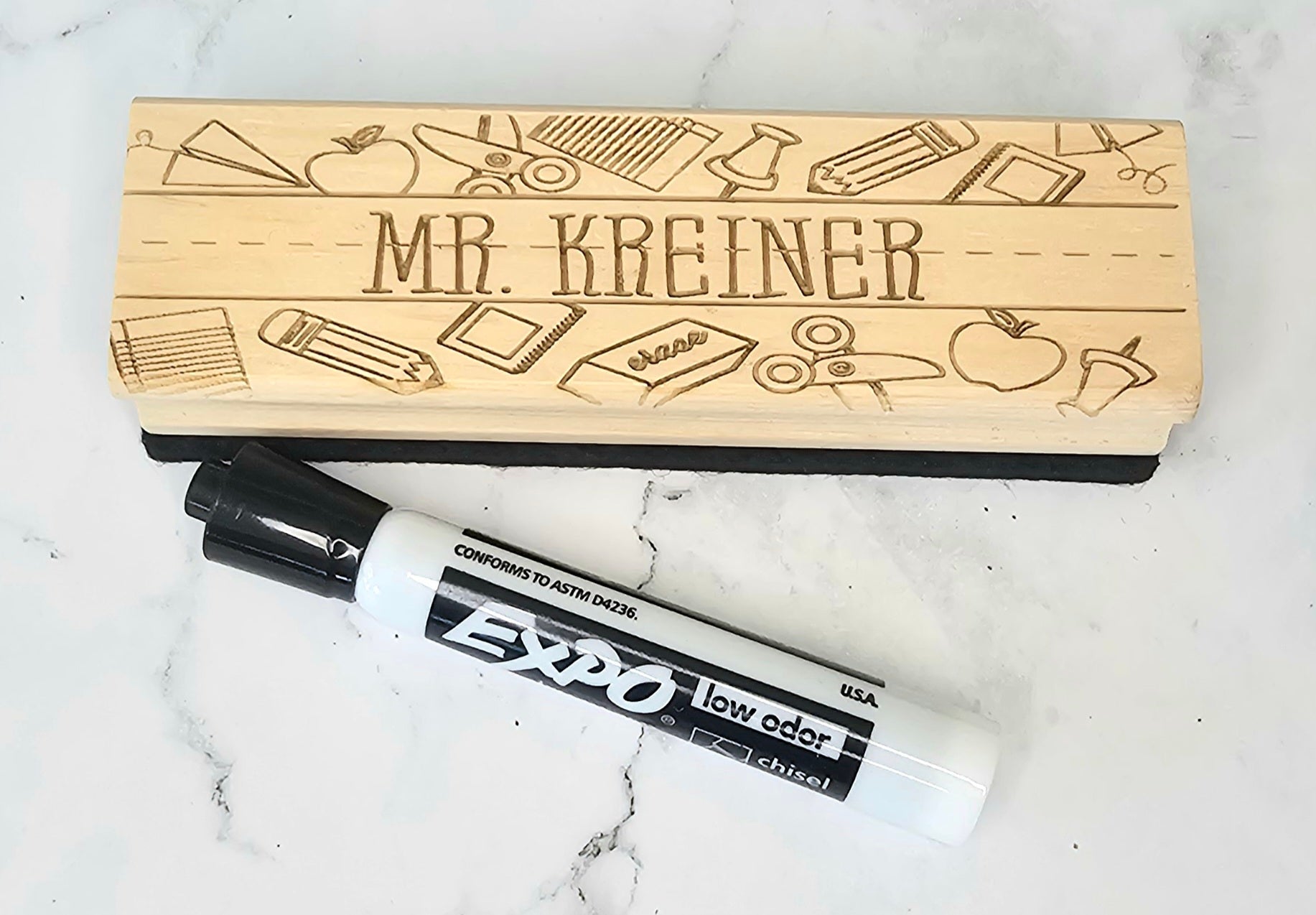 This beautifully crafted set features a custom engraved wooden dry erase eraser, personalized with your teacher’s name and accented with charming classroom-inspired designs. Paired with two black expo dry erase markers, it’s the perfect blend of style and function for any classroom.